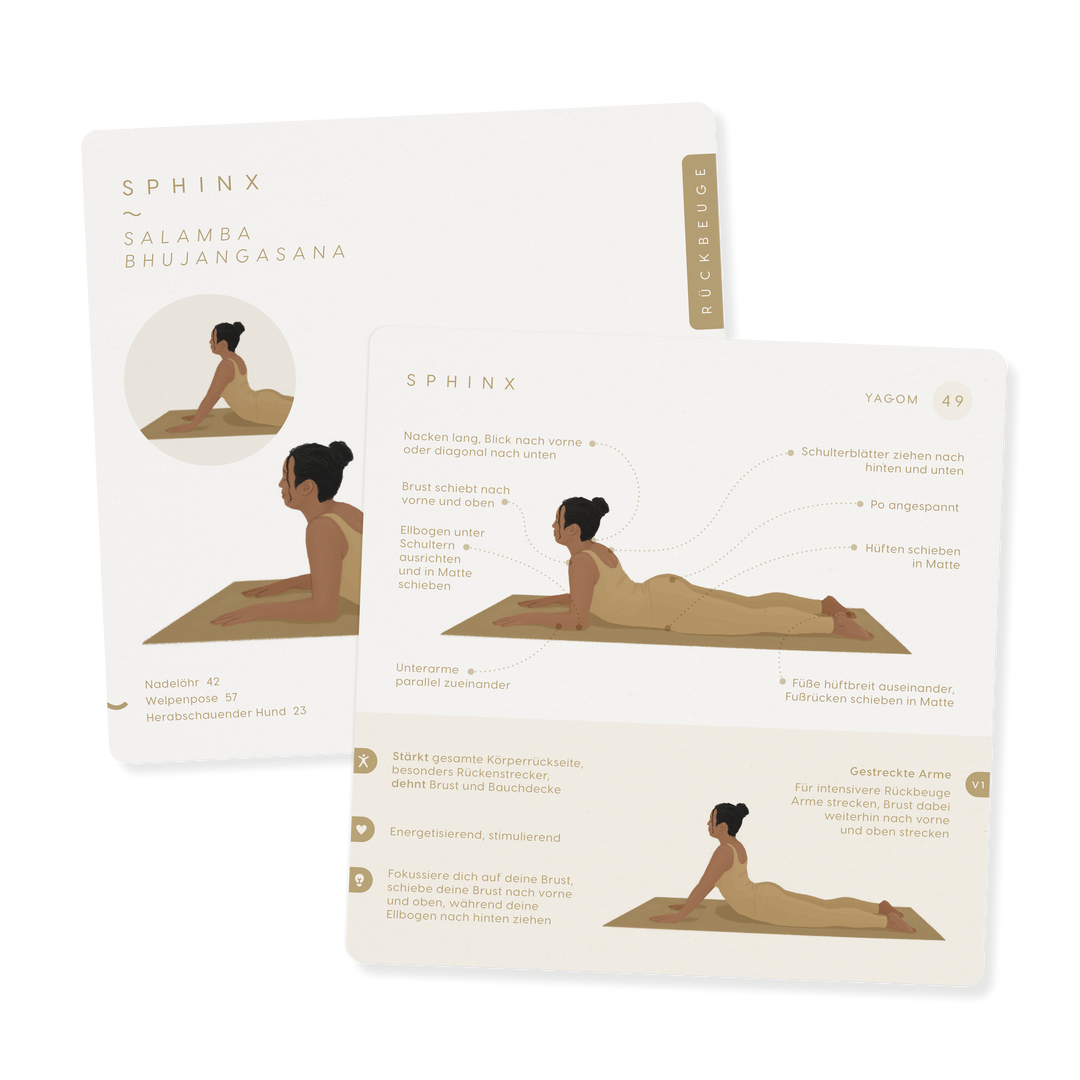 Die Vorderseite zeigt dir die illustrierte Pose mit deutscher und Sanskrit Bezeichnung. Auf der Rückseite findest du die wesentlichen Hinweise zur Ausführung, sowie die körperliche & geistige Wirkung der Pose und die jeweiligen Variationen.